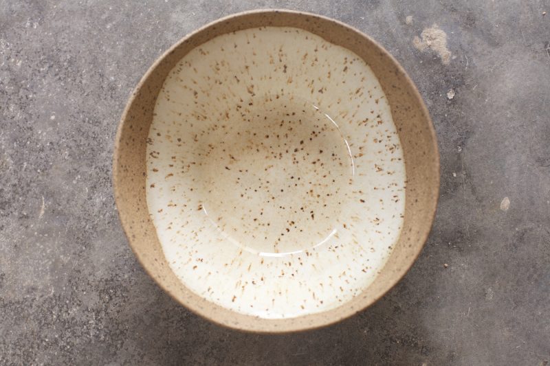 Esmaltado na cor Areia, um tom de bege suave com pontinhos escuros, com a borda sem esmaltação, preservando a textura natural do Barro Tabaco.